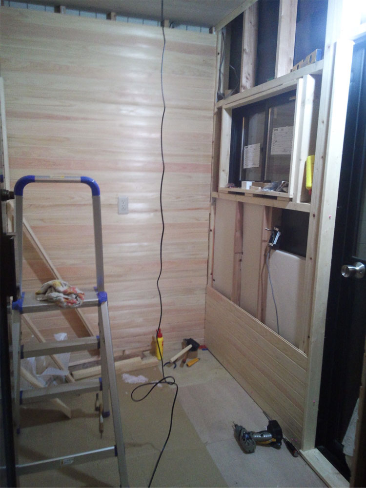 | 2012年3月27日 防水シートが余ったので、側面に張ってみました。 なにせ素人が作業するのでこのへんは慎重に! これで内装作業も並行して進めます。 |