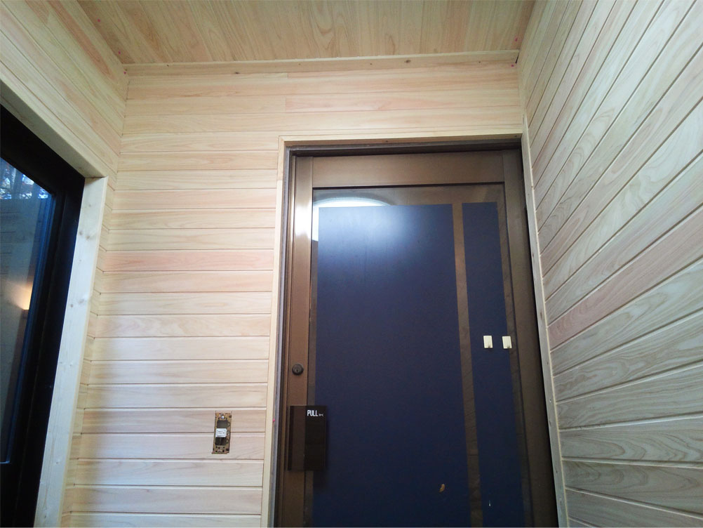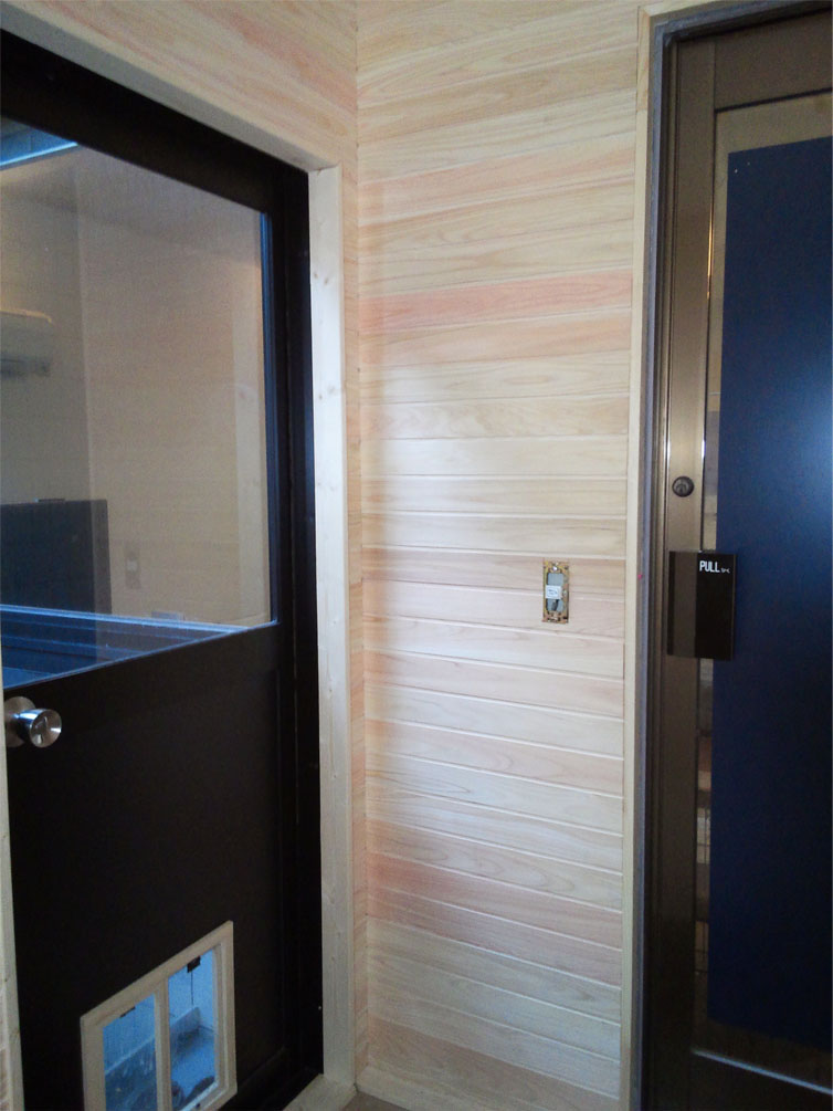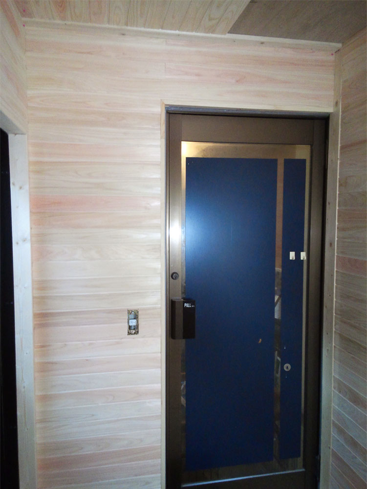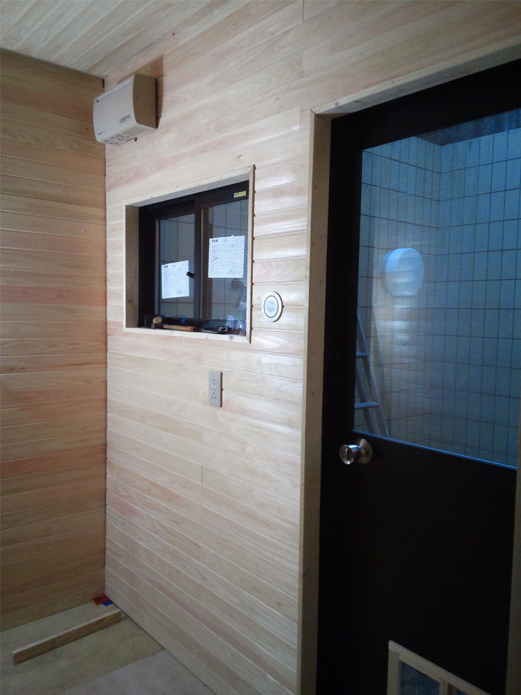 | 2012年4月22日 天井は張るのかなりしんどいです。 腕がだるくなります。あと首も。 総ヒノキになってしまいました。 サウナ風呂ではありません。 |